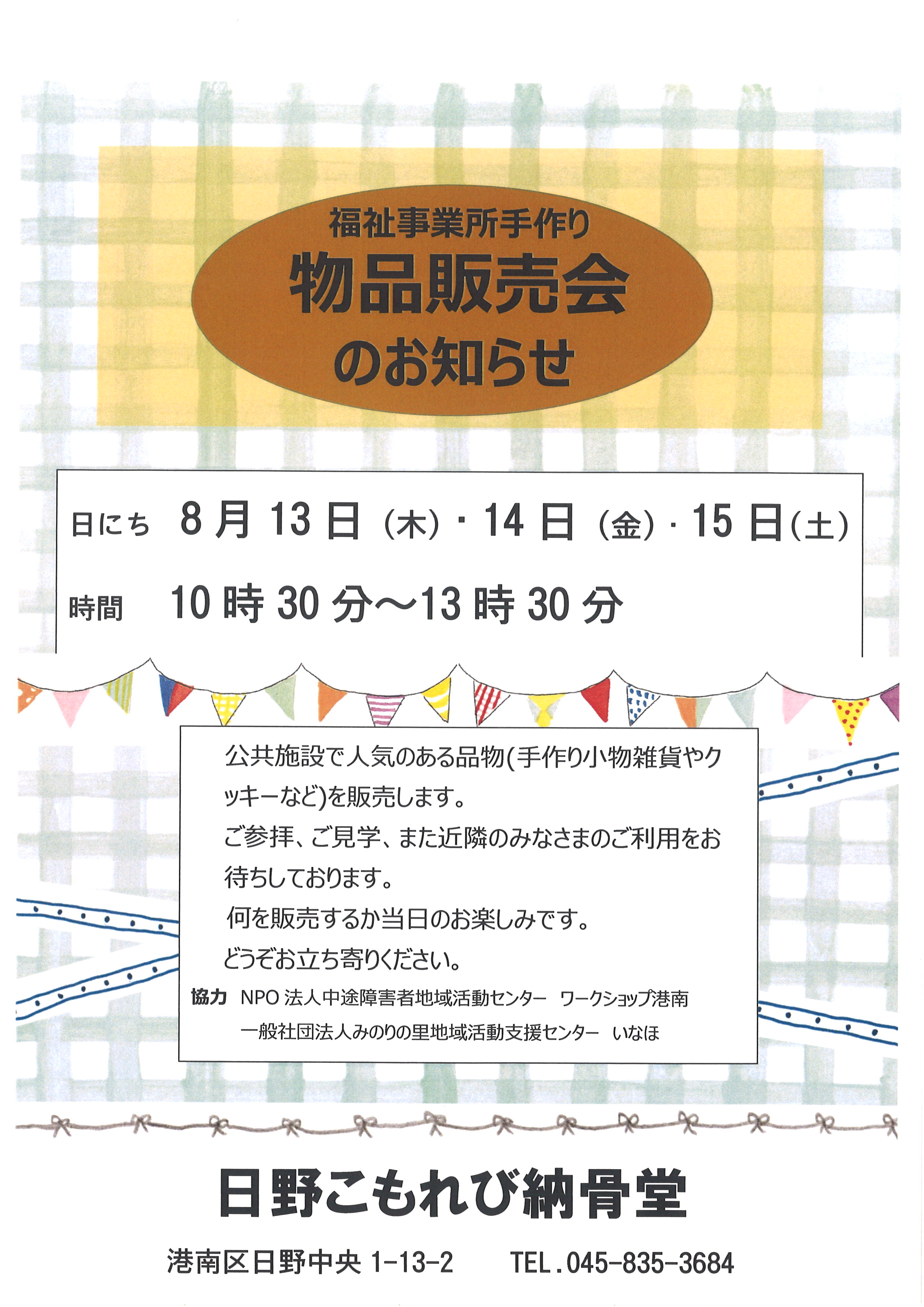 日野こもれび納骨堂に於いて、8月のお盆期間中に小物雑貨・各種クッキー等を販売いたします。