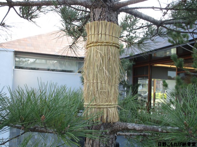 先日、「藁ぼっち」をホームページにアップいたしましたが、同じ日に害虫被害を防ぐために松の幹に「こも」を巻きました。