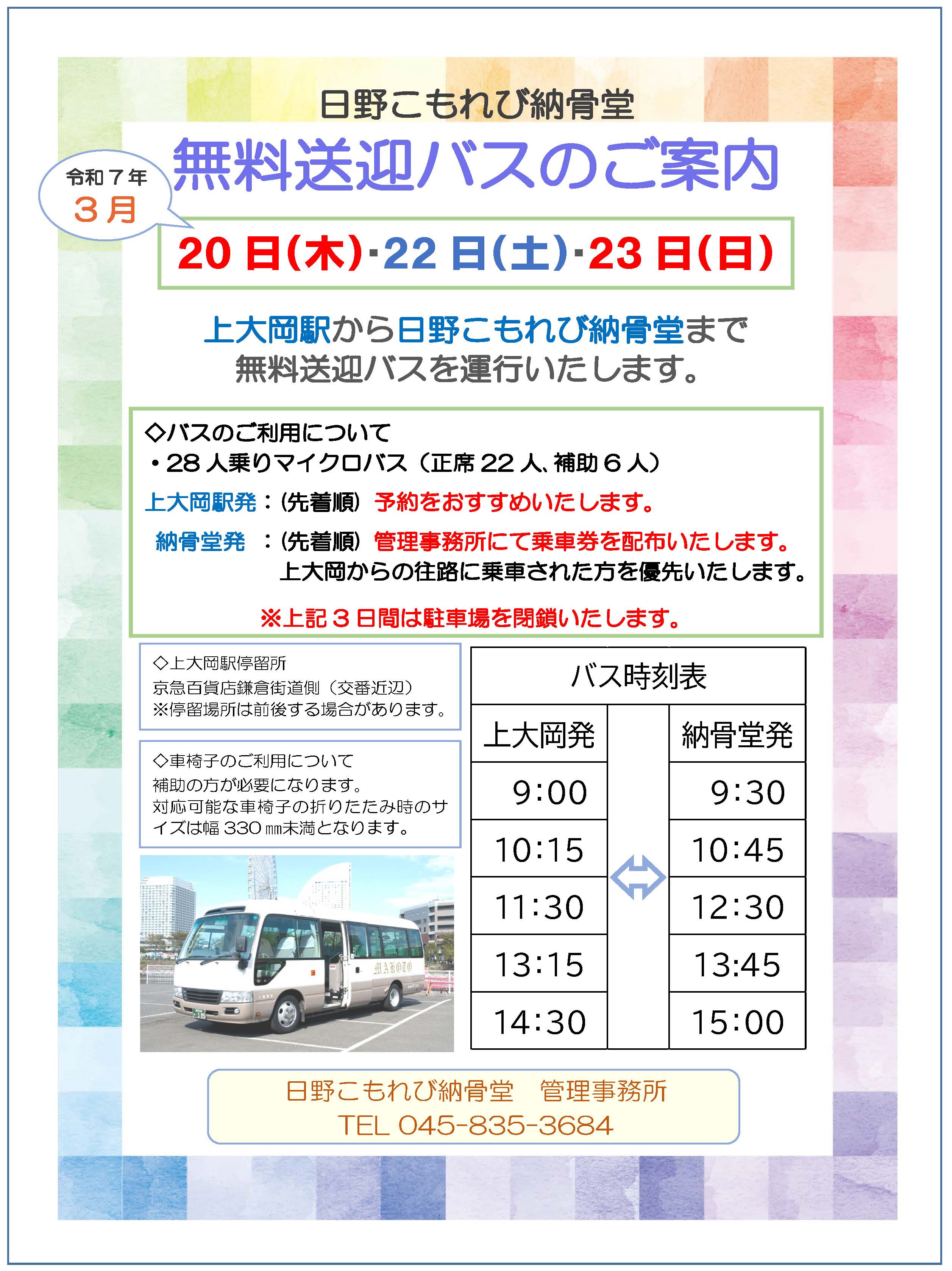 3月20日、22日、23日の三日間 上大岡⇔納骨堂の無料送迎バスを運行いたします。
