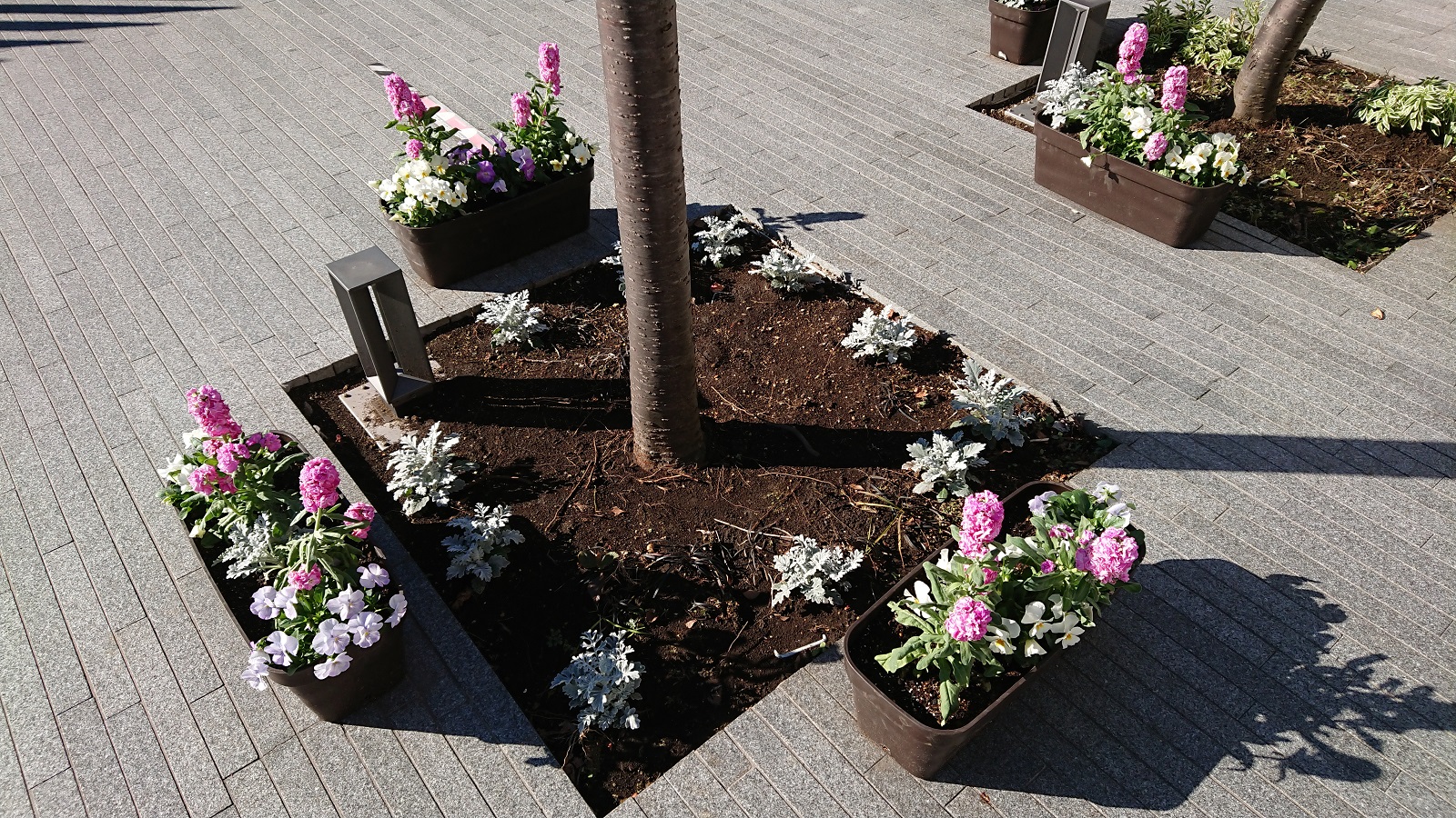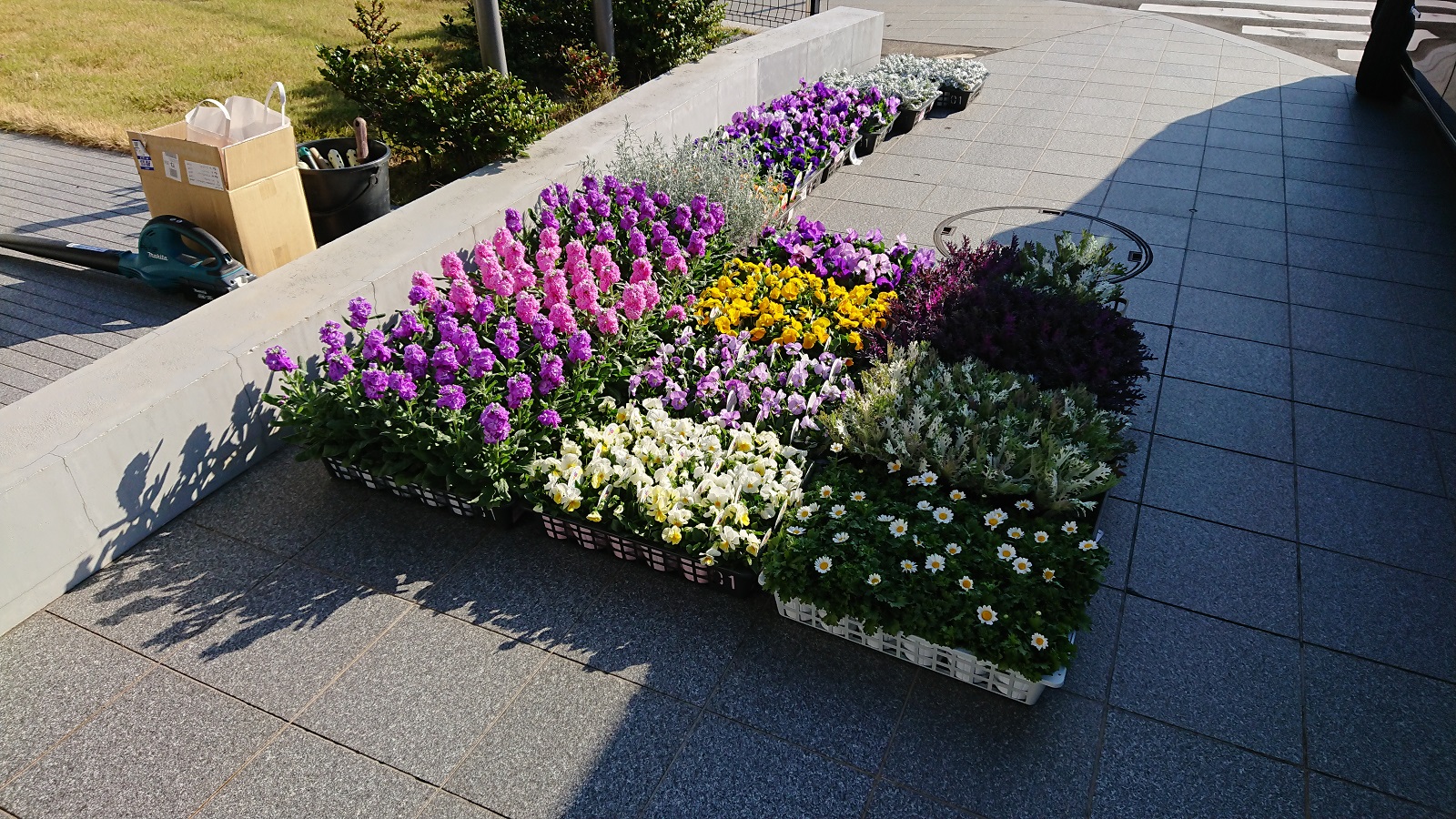 これまでは駐車場周りのタブノキ下とプランター等に植えていただいておりましたが、今回は正門の花壇に