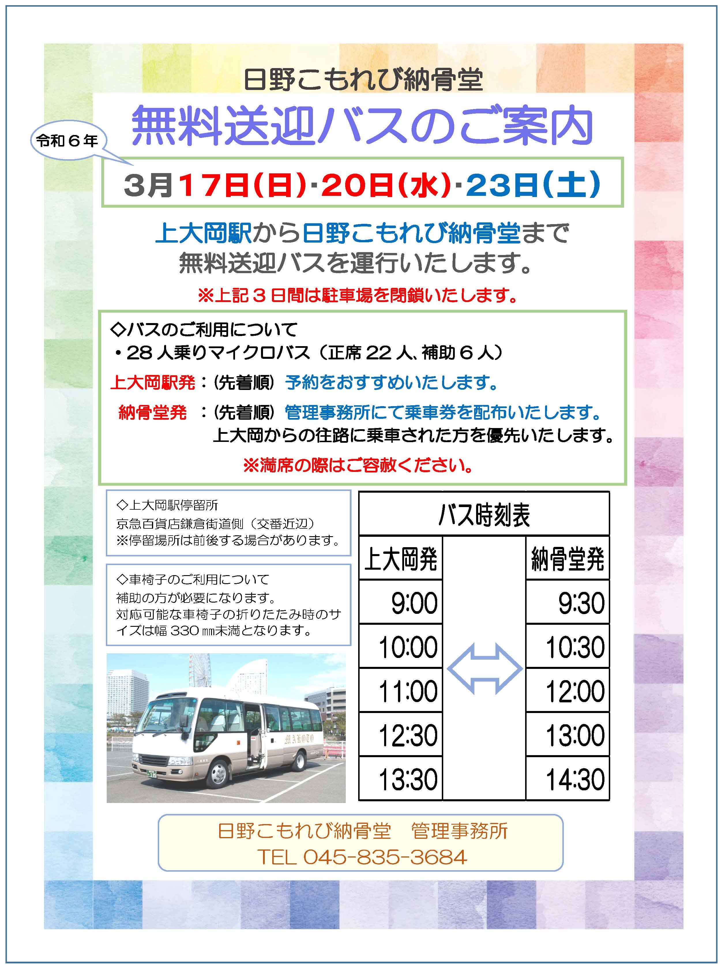 お彼岸期間中の三日間につきまして、京急上大岡駅から日野こもれび納骨堂まで無料シャトルバスを運行いたします。
