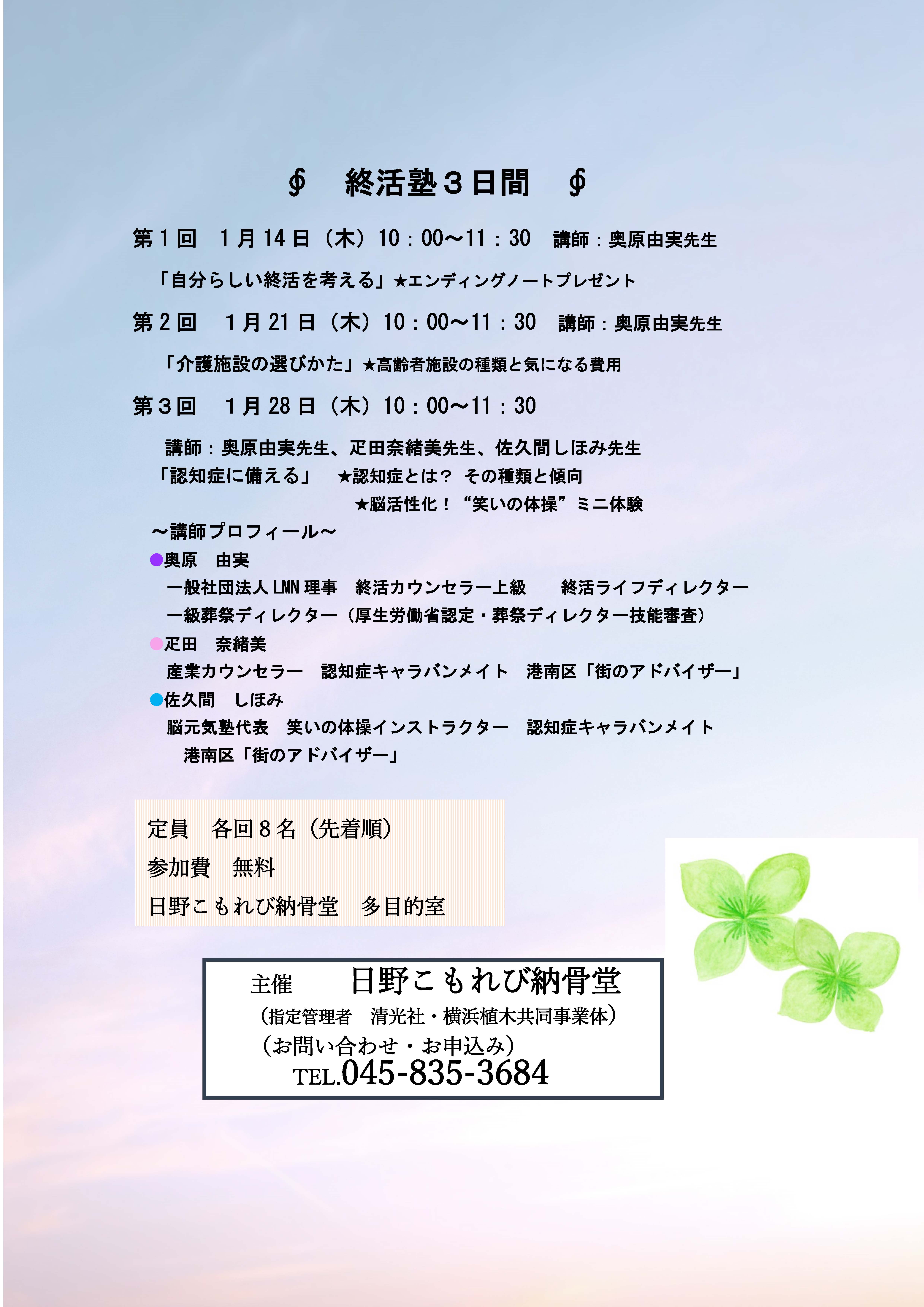 指定管理者の自主事業として、日野こもれび納骨堂主催「終 活 塾 3 日 間」の