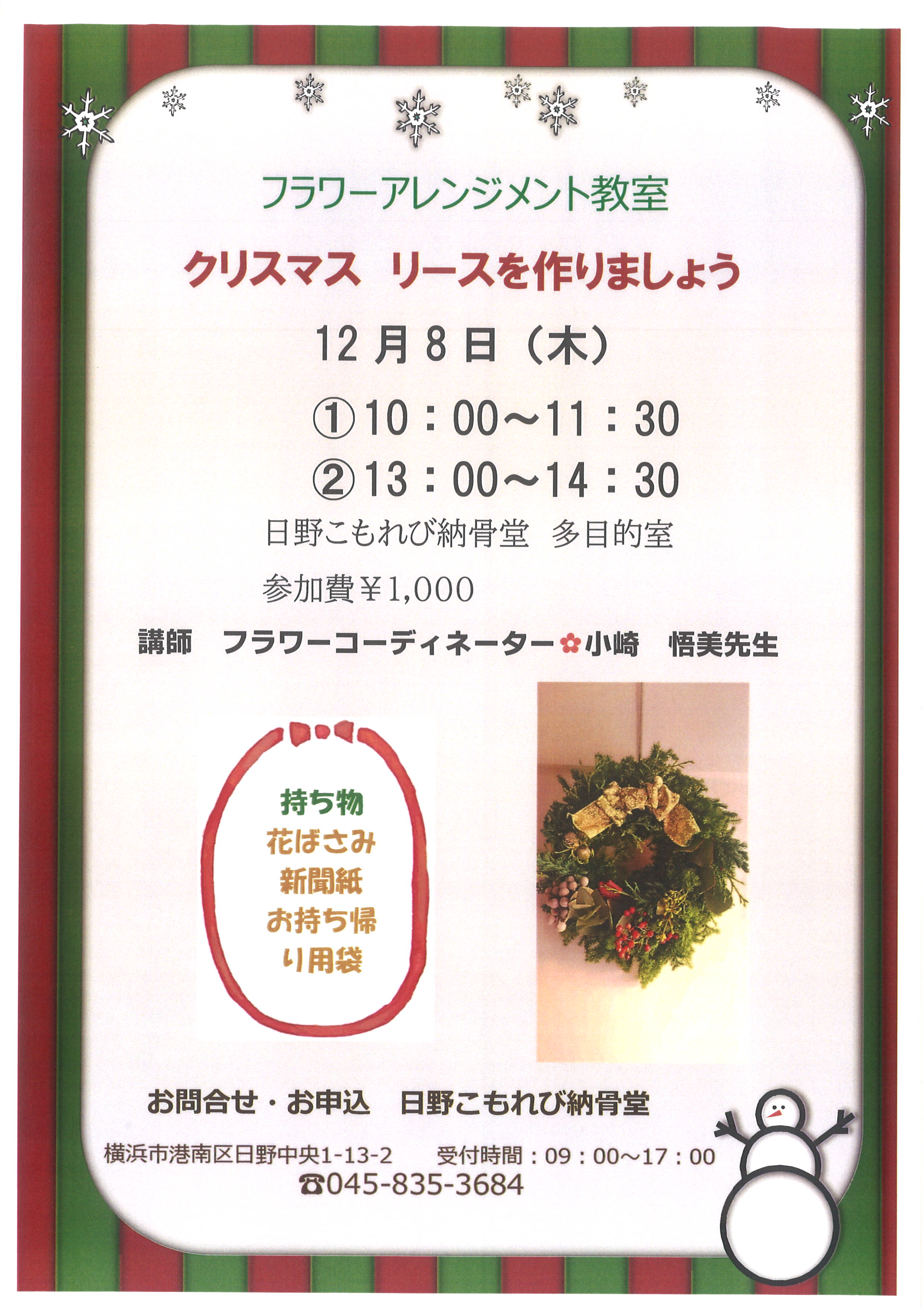 12月8日(木)に予定をしております「フラワーアレンジメント教室・Xmasリースづくり」について、