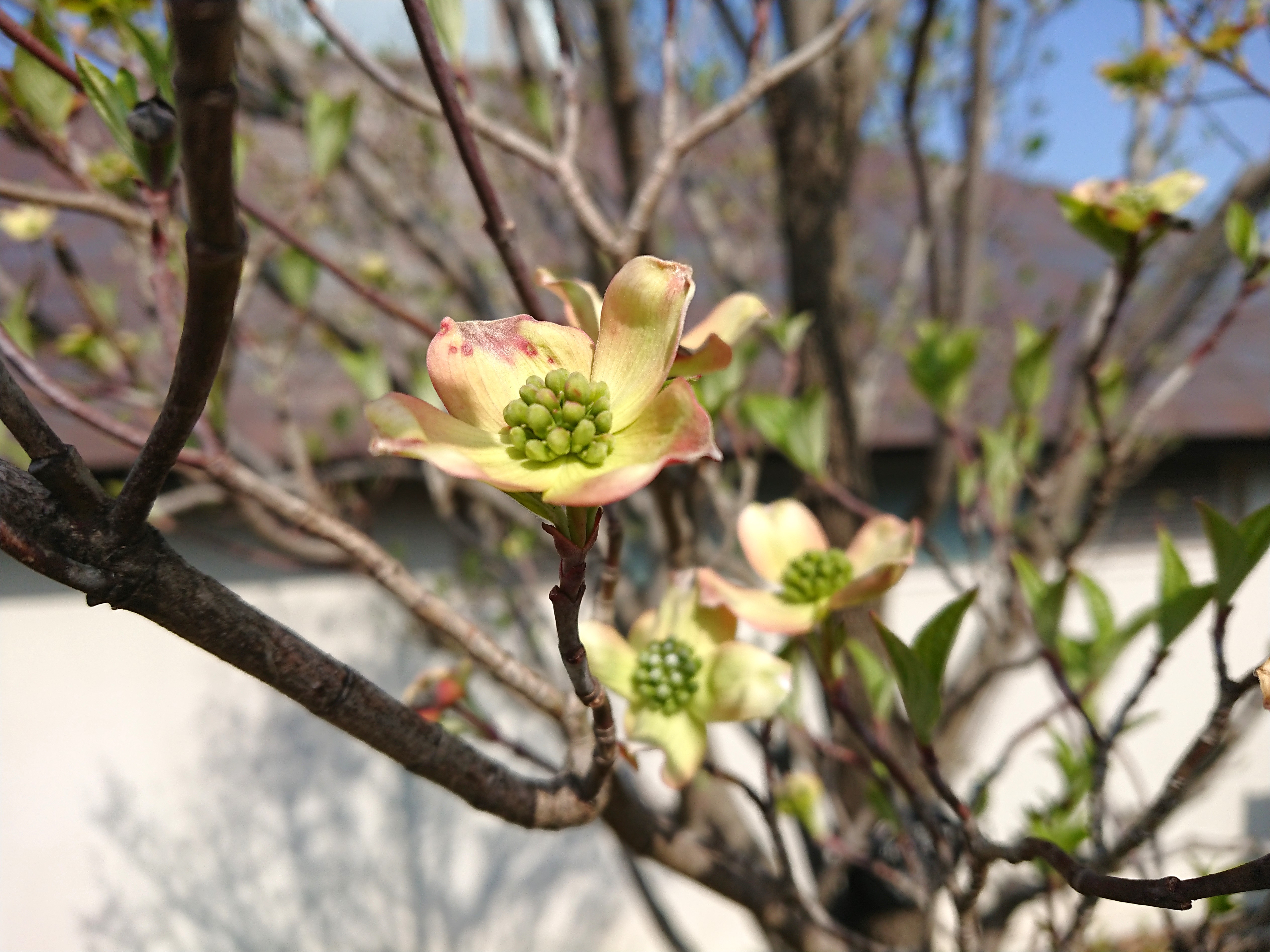 シンボルツリーのハナミズキが咲き始めました。