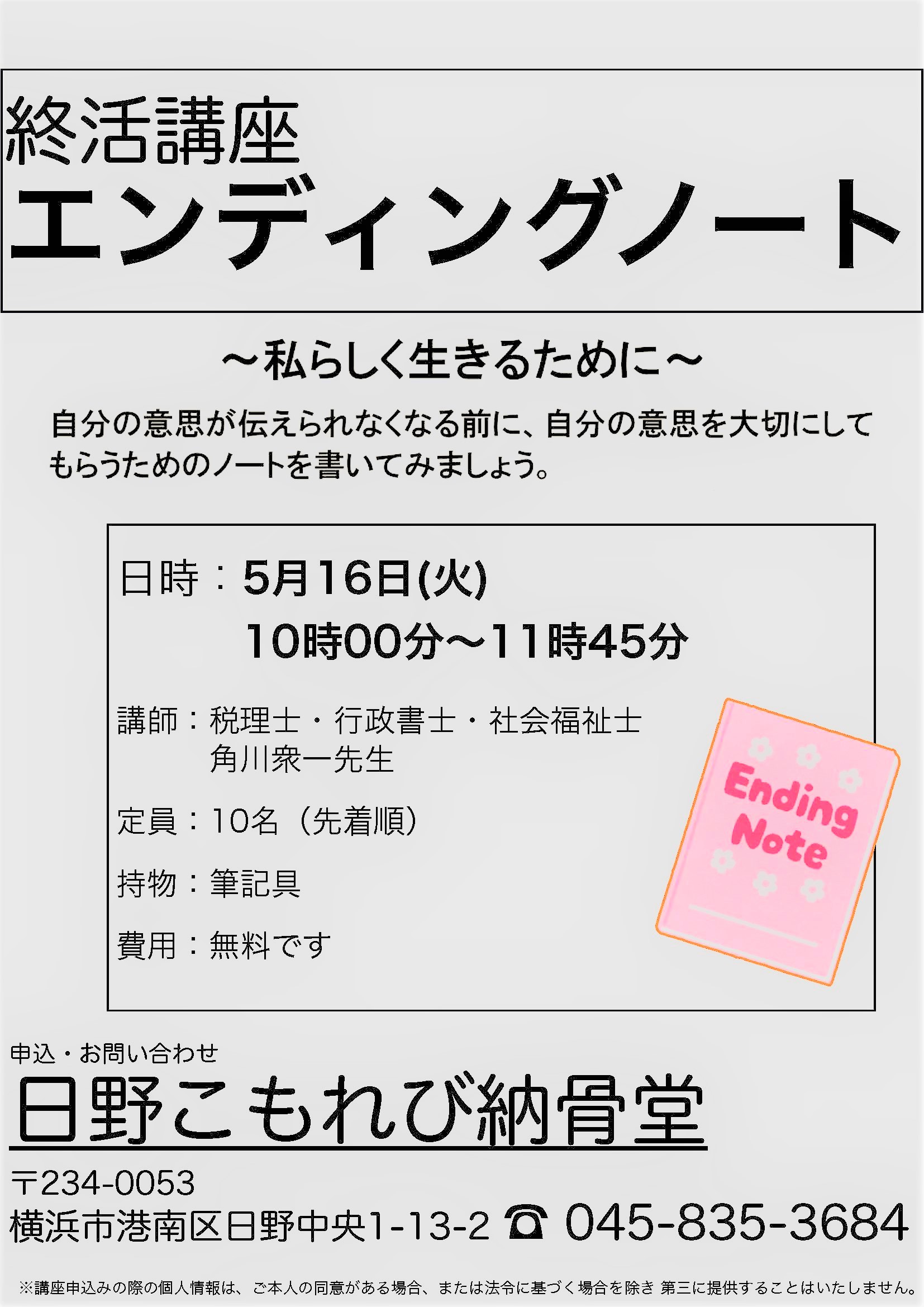 日野こもれび納骨堂では、エンディングノートの書き方などを講師がご説明いたします。