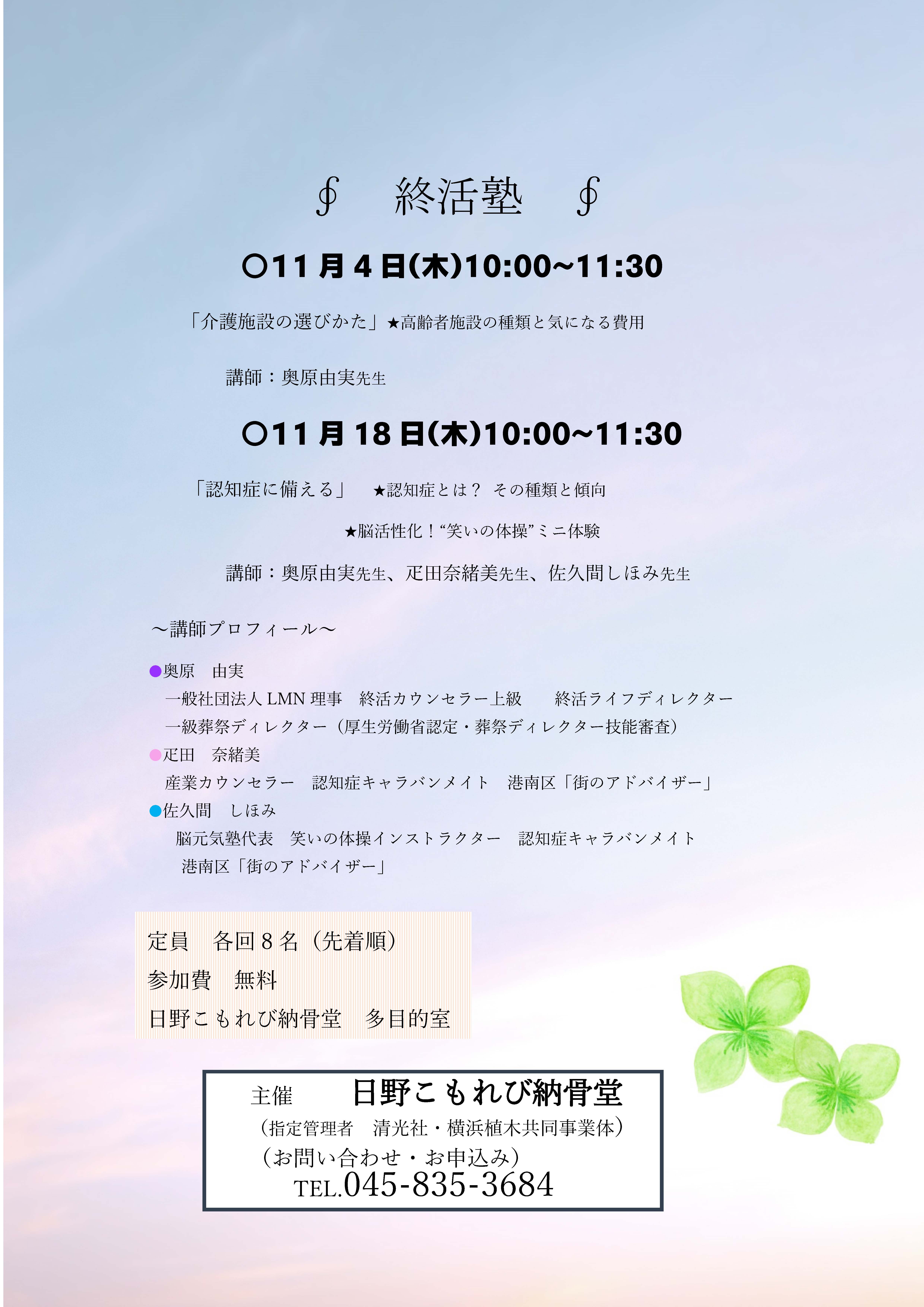 指定管理者の自主事業として、日野こもれび納骨堂主催「終 活 塾 2 日 間」の セミナーを2回に分け開催いたします。(一回だけの参加もできます)