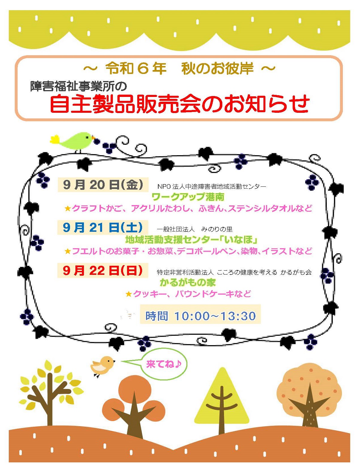 お彼岸中の3日間、障害福祉事業所の自主製品販売会を開催いたします。