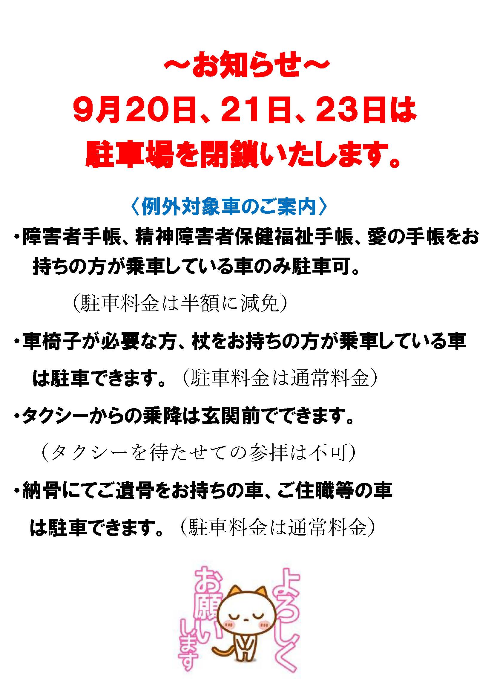 お知らせ 「秋のお彼岸 駐車場閉鎖」