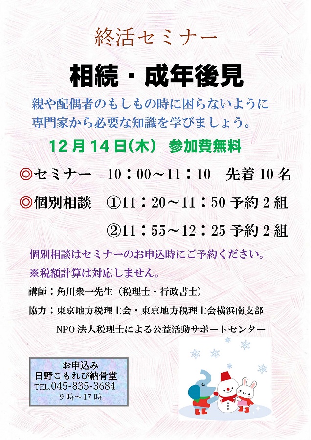 【募集】12月14日(木) 👨👩👦相続・成年後見についての講習会👩🏻🤝🧑🏻