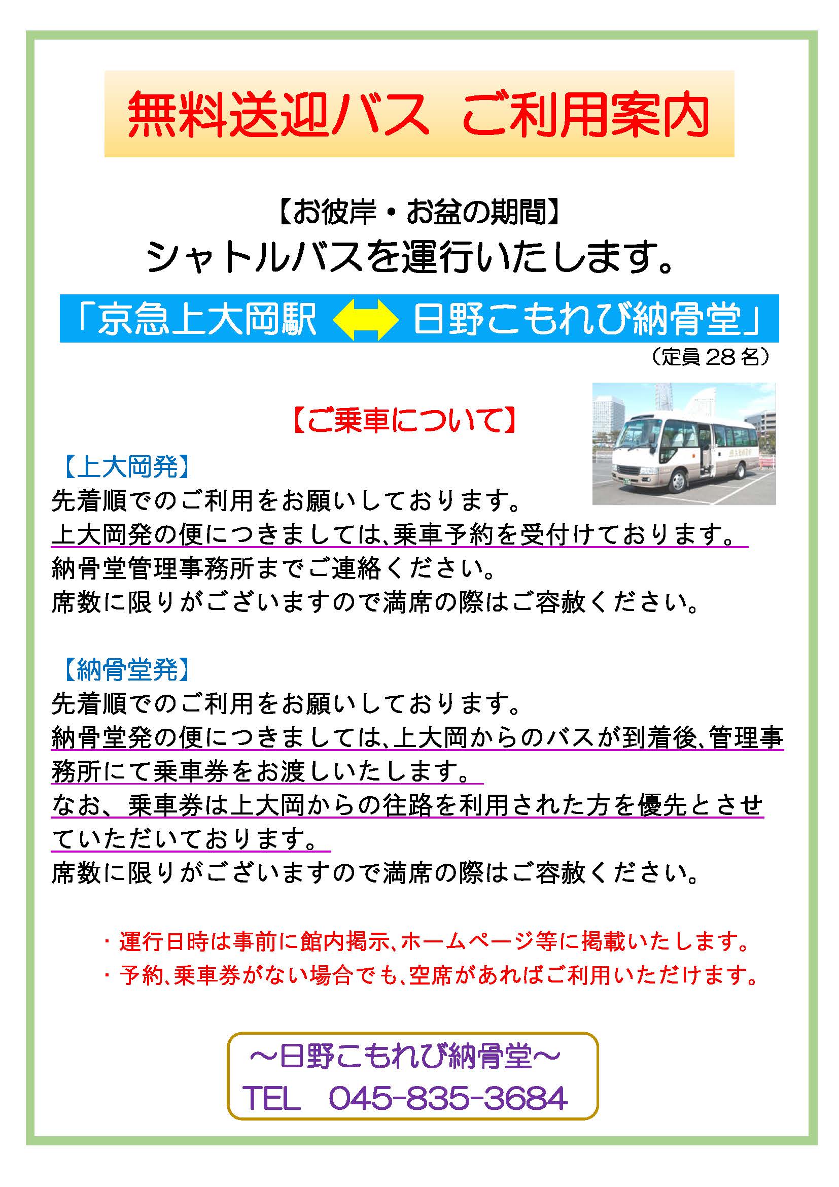 お彼岸期間中の三日間につきまして、京急上大岡駅から日野こもれび納骨堂まで無料シャトルバスを運行いたします。