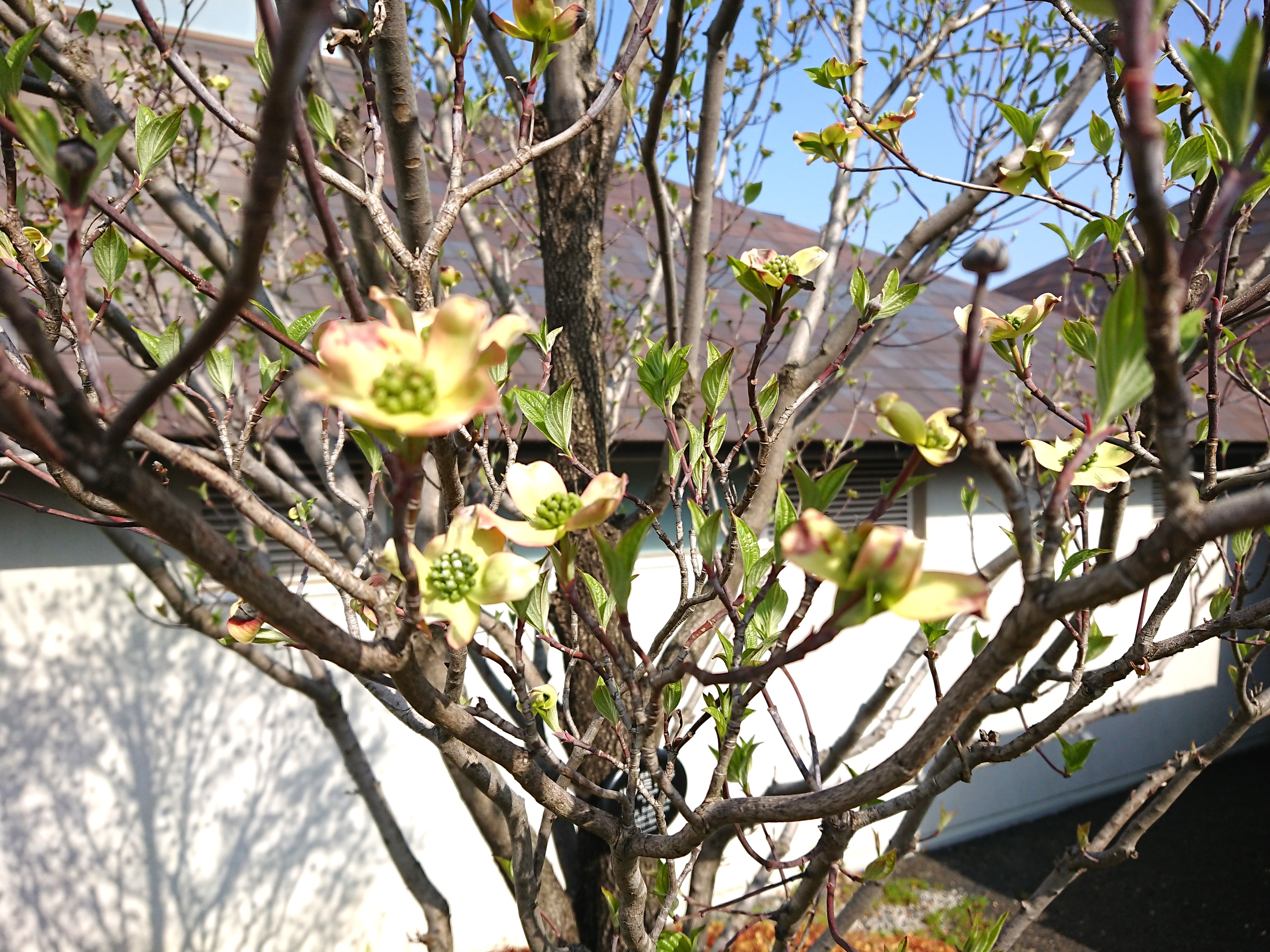 シンボルツリーのハナミズキが咲き始めました。