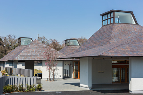 連続する⽅形の深い屋根が⾃然の⾵や光、周辺の樹⽊やランドスケープと⼀体感を⽣み出すよう設計されています。